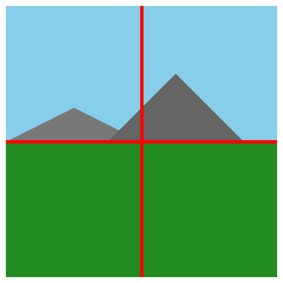 Wenn ein einheitlicher Prompt für alle Bildteile verwendet wird, können unerwünschte Details in Bereichen auftauchen, wo sie nicht vorgesehen sind. Hier ein Beispiel: Eine wunderschöne Grasfläche mit Bergen und Himmel, die in 4 unterschiedliche Abschnitte unterteilt wurde. Stell dir vor jeder Tile wird mit dem Prompt für das ganze Bild skaliert.